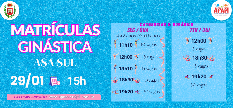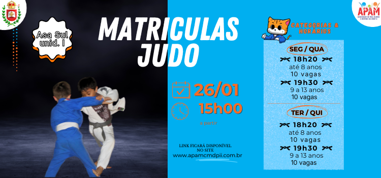 Marículas para as Escolinhas Esportivas da APAM – Unidade Asa Sul! Garanta a vaga do seu pequeno atleta para um ano de muita saúde, aprendizado e diversão. Temos opções para todos os gostos: 🏊♂️ Natação 🥋 Judô ⚽ Futsal 🤸♀️ Ginástica