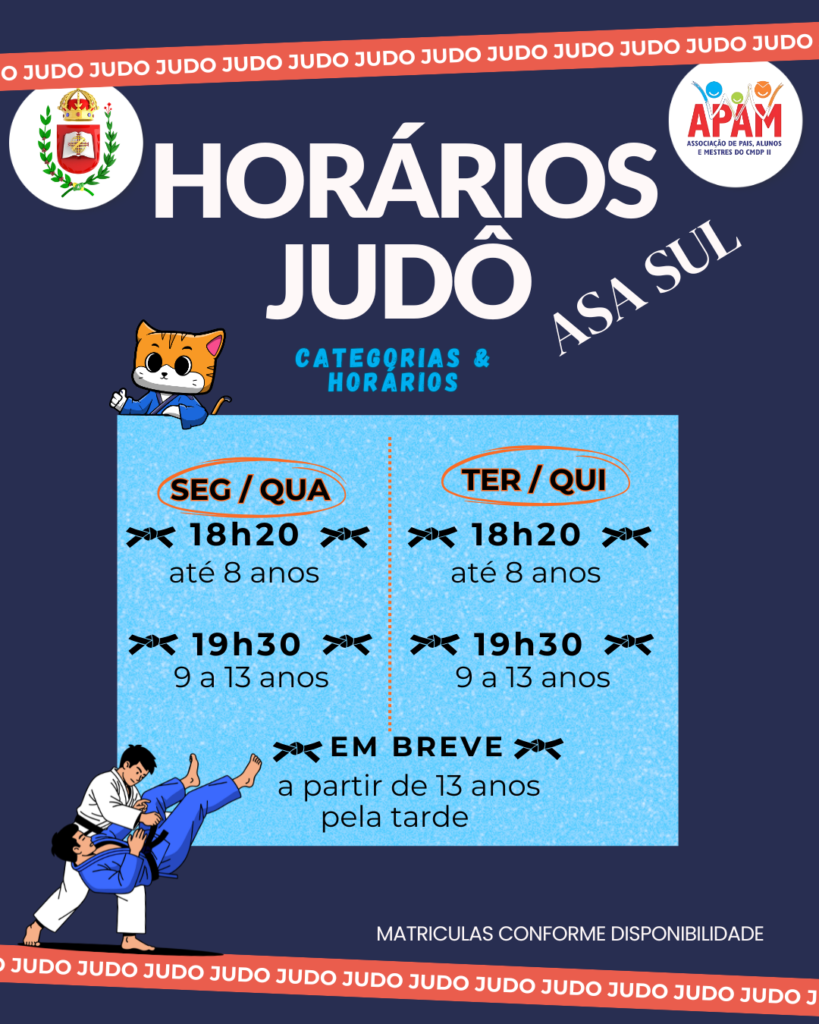 📌 Categorias, Horários e Vagas SEG / QUA – 4 a 8 anos | 9 a 13 anos 11h10 – 10 vagas 12h00 – 5 vagas 13h10 – 15 vagas 18h30 – 10 vagas 19h20 – 30 vagas TER / QUI – 4 a 8 anos | 9 a 13 anos 12h00 – 5 vagas 18h30 – 5 vagas 19h20 – 30 vagas ⚠️ As vagas são limitadas e preenchidas conforme ordem de inscrição.