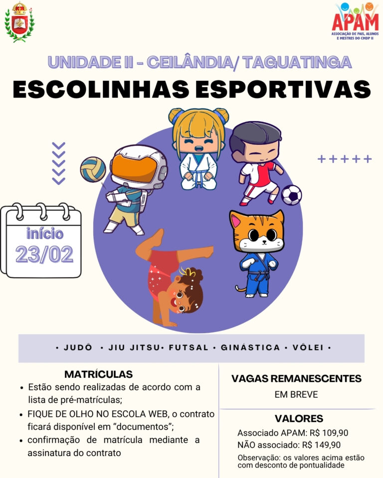 A Associação de Pais, Alunos e Mestres (APAM) informa que as Escolinhas Esportivas da Unidade II terão início em 23 de fevereiro.